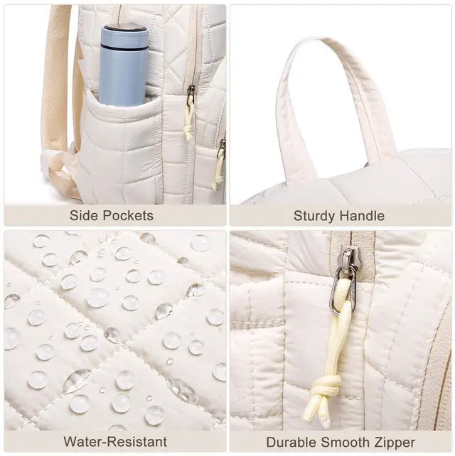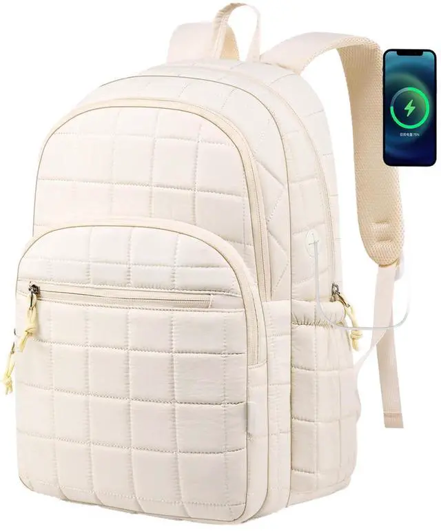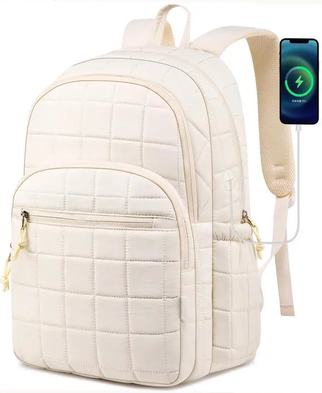 kadilong Laptop Backpack for Women College Travel, Quilted Daypack Bookbag for School Teen Girls Mochilas Mujer, Beige