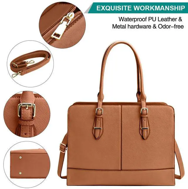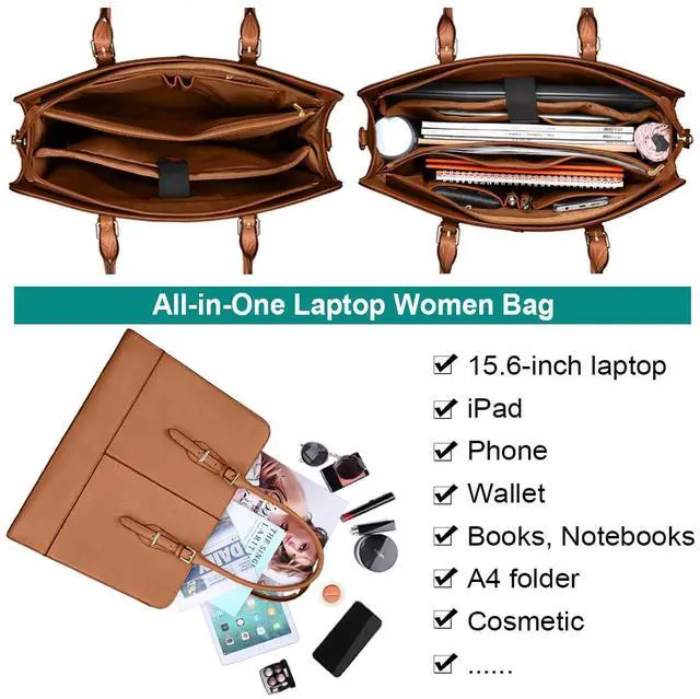 Ideal Organizer Womens Briefcase:Three layers are designed for different use: one laptop compartment to hold a 15.6" laptop and tablet with room to spare; one zip compartment to secure files and two open sections with room for cosmetic, wallet, A4 folder; Multiple pockets for small essentials, bottles; Exactly keep your daily business essentials well organized.