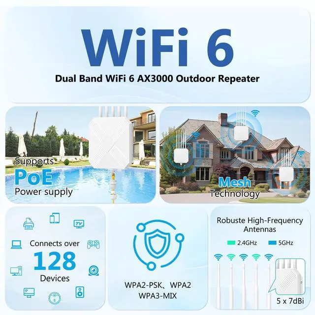 Dominate Long-Range CoverageUpgraded with 5 high-gain omnidirectional antennas and 5 built-in power amplifiers, this extender blankets areas up to 200300 meters (radius) with rock-solid WiFi. Connect up to 128 devices simultaneously, backed by a Gigabit Ethernet port for 1000/100/10Mbps speeds.