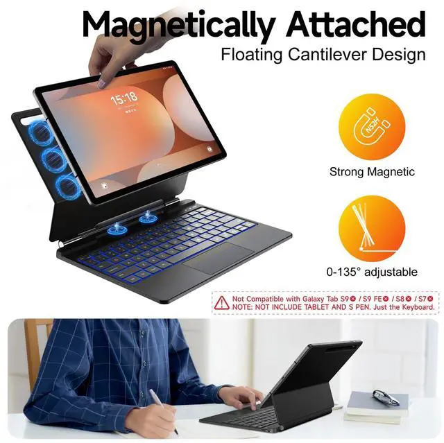 Transform Your Tab into a Laptop KillerMeet your Tab's soulmate: Magnetic floating cantilever lifts your screen like magic. Adjust angles 0-135° for perfect Netflix-binging or Zoom-crushing. Finally - a laptop experience without the $1,000 price tag.