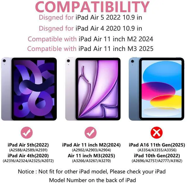 For iPad Air 11 inch Case with Keyboard: This for ipad air keyboard case compatible with iPad Air 11-inch M3 2025 (A3266/A3267/A3270), compatible with iPad Air 11-inch M2 2024 (A2902/A2903/A2904), compatible with iPad Air 5th Generation 10.9 inch 2022 (A2588/A2589/A2591), compatible with iPad Air 4th Generation 2020 ( A2072/A2316/A2324/A2325 ), compatible with iPad Pro 11 inch 1st Generation 2018 (A1980/A2013/A1934). Please kindly check the model number on the back of iPad before purchasing.