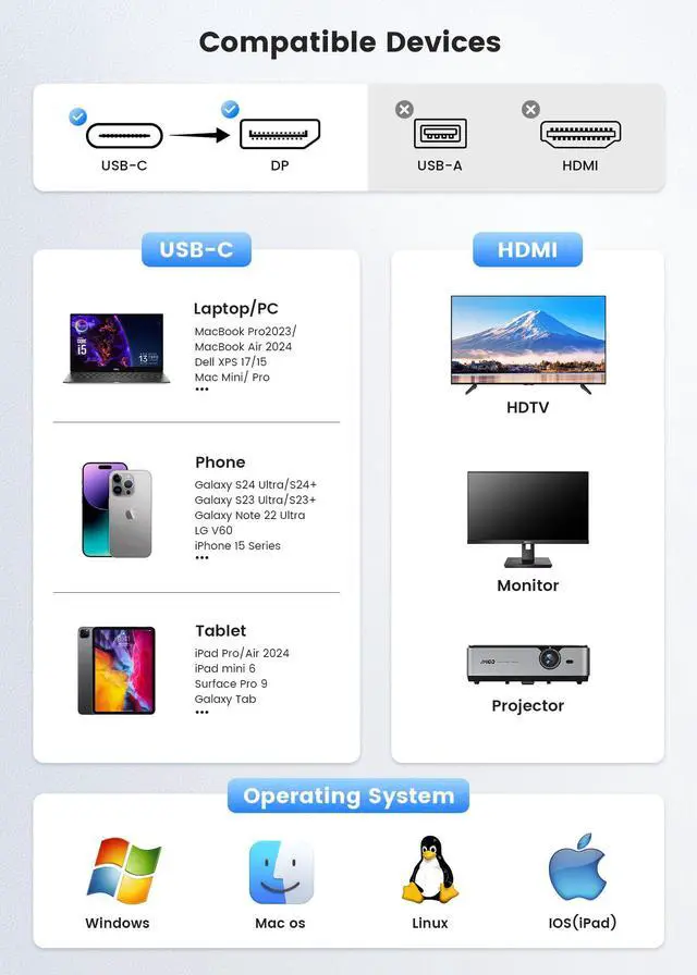 Wide CompatibilityFor Type C ports with video output function and Thunderbolt 3 & 4 Ports. Compatible with MacBook Pro 2016-2021, MacBook Air 2018-2022, iMac 2017-2020, iPad Pro 2018-2021, iPad Air 4/5, iPad mini 6, Galaxy Fold Series/A90/ S22/S21/S20/S10/S9/S8, Note 20/10/9/8, G