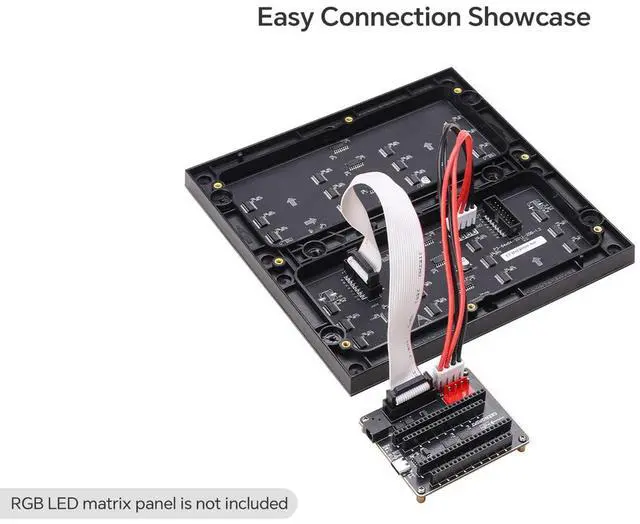 The adapter includes a standard HUB75 connector and dual VH-4P ( 3.96 mm pitch) power connectors, making it compatible with common RGB LED matrix panels. This allows developers to easily