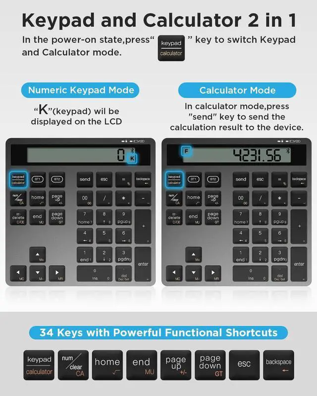 Full Numeric Layout with 34 Keys Designed like a standard number keypad, including NumLock, Tab, ESC, Delete, page navigation, and calculator shortcut. Get efficient, fast input for Excel, accounting apps, and more.