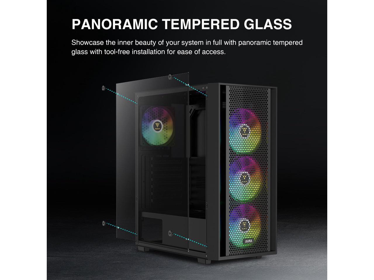 PC Case with Panoramic Tempered Glass: The mid tower case showcases the inner beauty of your gaming pc system in full with a full-sized tempered glass cover with tool-free installation for ease of access
