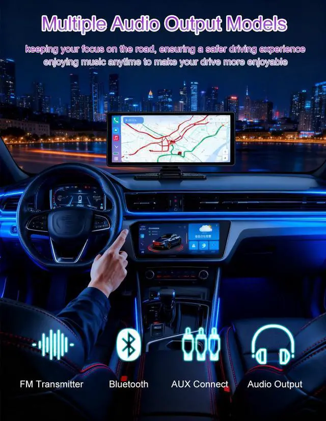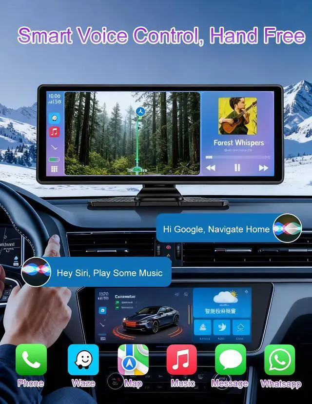 Wireless Apple Carplay and Android Auto Ideal for apple play for car and android auto screen for car users. You can access music, map navigation, messages, hands-free phone call and etc. No extra downloads needed, just connect bluetooth and WiFi or USB then go! It also supports voice control via Siri or Google assistant, speaking commands through wireless car play touch screen, providing you with a safer and more convenient driving experience