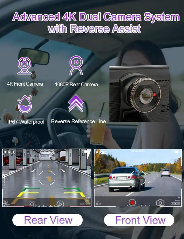 Advanced 4K Dual Camera System with Reverse Assist Drive confidently with 4K dash cam and 1080P backup camera, recording high-definition footage for accident-proof security. This car play screen for car with re