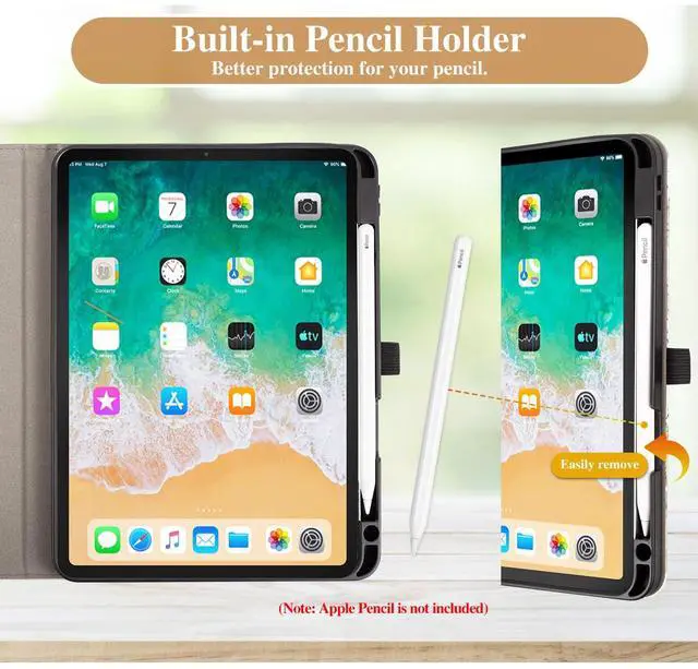 [Built-in Pencil Holder & Support Pencil Charging & Top Button Touch ID]: Built-in Pencil holder and side elastic band pencil holder securely carries and protects your Pencil wherever you go,prevent losing or breaking your Pencil when you're walking or outdoor.(Note:Pencil is Not included).Support Pencil Wireless Charging and Attaches Magnetically. (NOTE:Remove the Pencil Sleeve before charging.) Cutout hole fit button design, support Top Button Touch ID