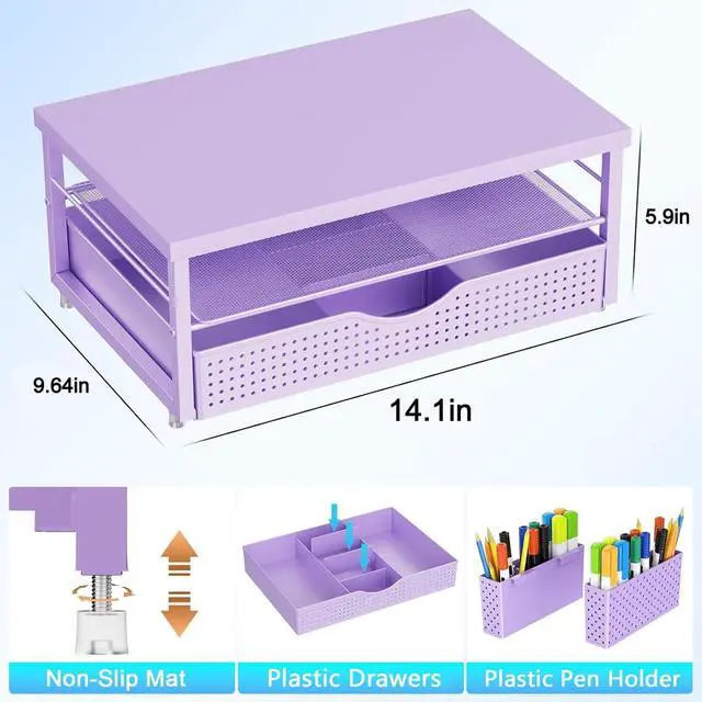 Organized StorageThis desk monitor stand/organizer features two tiers of storage for files and notes. Equipped with two pen holders and a drawer , it effortlessly organizes pens, scissors, and other desk essentials, keeping everything within reach.
