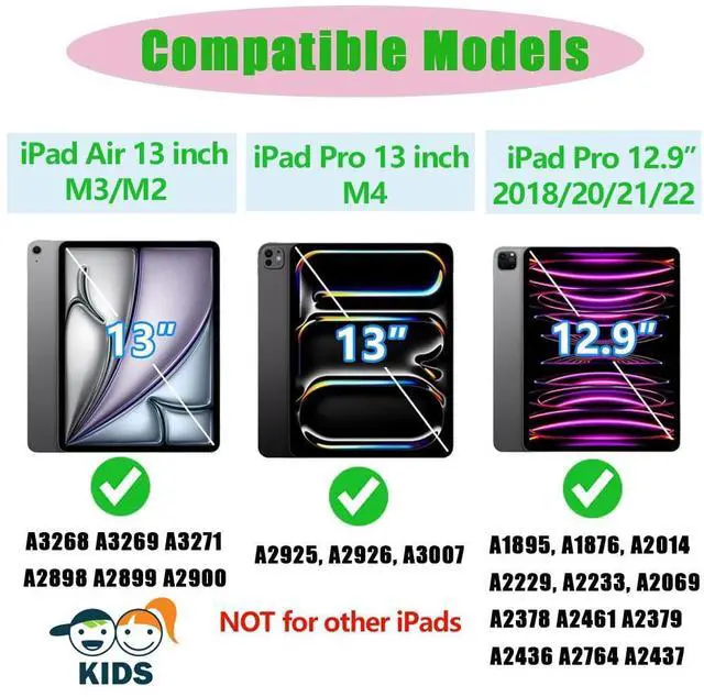 Compatibility Designed for iPad Pro 13 Inch M4 2024 ( Model: A2925, A2926, A3007 ), Air 13"(M3/M2, 2025/2024) / iPad Pro 12.9 Gen 3 (2018) : A1895, A1876, A2014, A1983 / iPad Pro 12.9 Gen 4 (2020) : A2229, A2233, A2069, A2232, iPad Pro 12.9 Inch 5th generation 2021(Model: A2378 A2461 A2379 A2462), iPad Pro 12.9 Inch 6th generation 2022(Model: A2436 A2764 A2437 A2766)