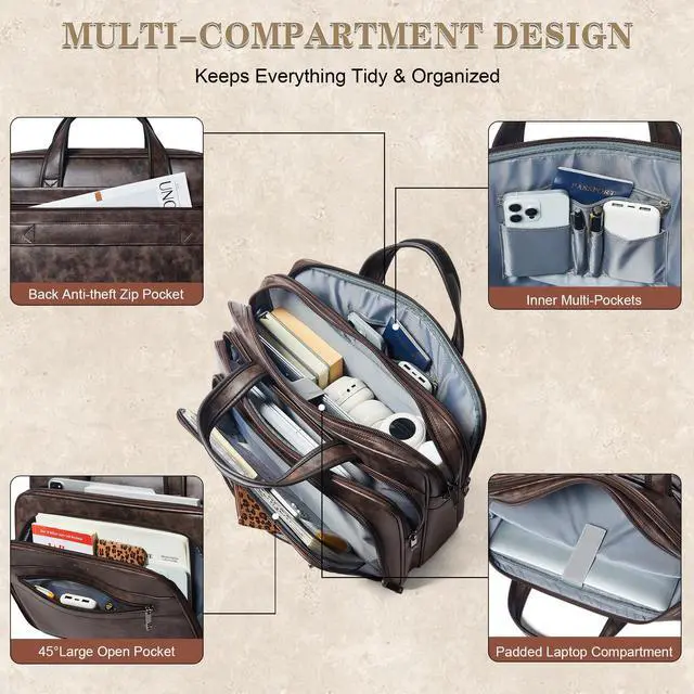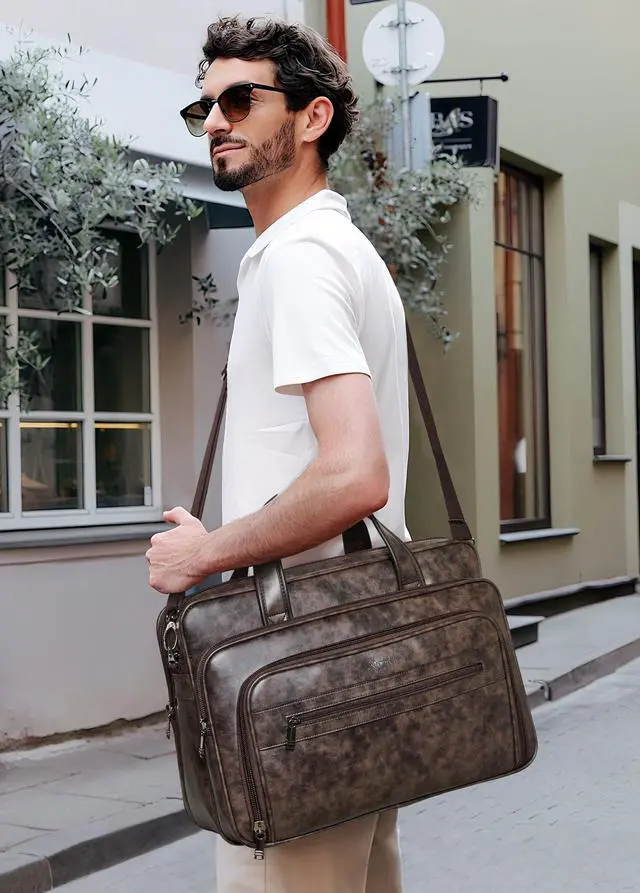 HIGH END MATERIALThis Messenger Bag for Men is crafted from water-resistant,wrinkle-resistant and scratch-resistant premium vegan leather made,which is sturdy and soft texture offer great feeling can stand up everyday use,easily cope with a variety of scenarios such as daily splashes and light rain.Smooth metal zip for durability and strong,reinforced stitching won't easy to crack can be used for a long time.Professional Briefcase designed for the Business Men&Women who chasing practicali