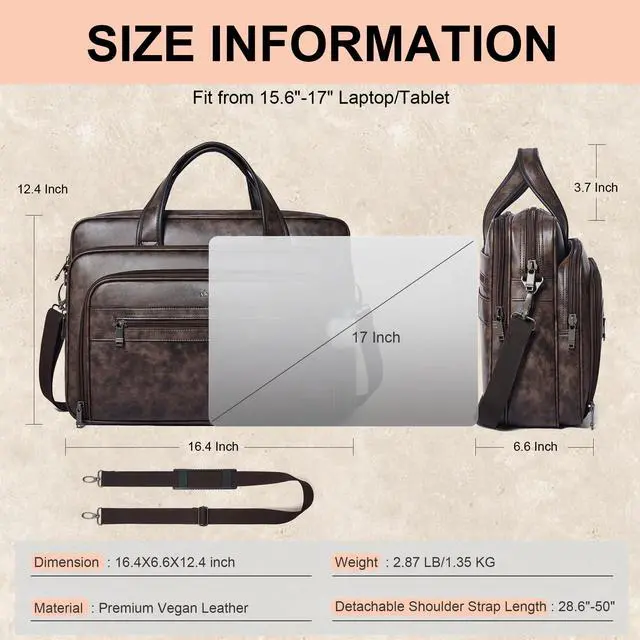 VERSATILE LAPTOP BAGThe dimension of this Retro and fashion Leather Messenger Bag is 16.4"L x 6.6"W x 12.4"H,Weight:2.87 LB.Large capacity design can hold all your work necessaries,perfectly fit for people in business and work.Multi usage methods it can be used as a Business Laptop Bag,Crossbody Bag and Shoulder Bag,you can also remove the shoulder strap use it as a Professional Leather Briefcase and carry it use the leather padded handle that could effectively reduce your hand stress