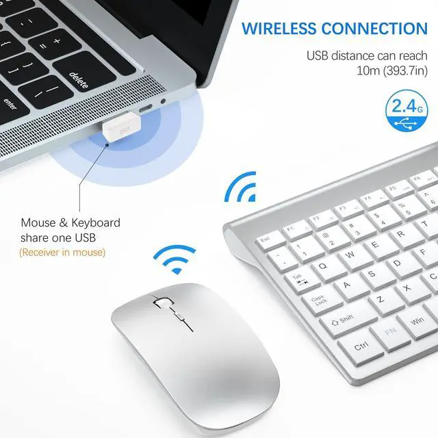 Stable 2.4G Wireless ConnectionPowerful and reliable connection of wireless keyboard mouse is up to 10 m(393.7in). Wireless keyboard with mouse combo share a Nano receiver (stored at the bottom of the mouse) without installing any additional software, plug and play. Keep your desk clean and tidy.