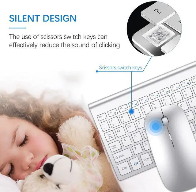 Silent Keyboard and 5 DPI MouseThe wireless office keyboard s scissor switch keys provide less noise. Light and responsive tactile keystroke makes typing soft and comfortable. Silent co