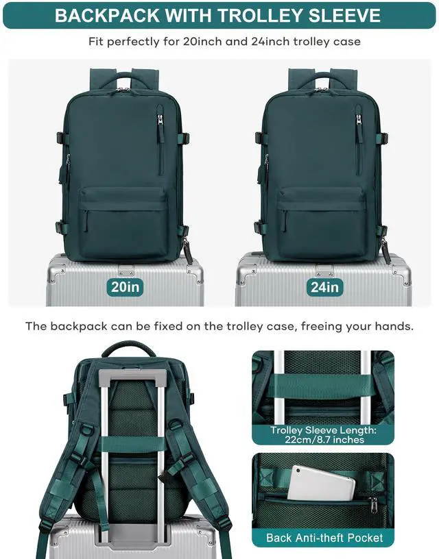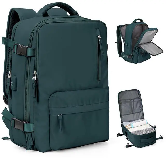 Large Capacity Multi-Pocket and Laptop CompartmentTravelling university backpack has three compartments and 2 front pockets, the capacity is about 32L, you can put down 3-5 days clothes. The side pockets are designed with elasticated straps and the umbrella cups are not easy to fall off. Near the back of this travel bag is a laptop compartment that fits most 15.6 inch laptops.