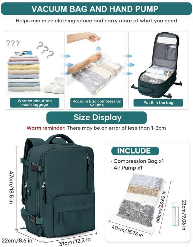 Compression Bag and Hand Vacuum PumpThis travel backpack comes with a translucent vacuum compression bag and a manual vacuum pump. The size of the vacuum compression bag is 60*40CM/23.62*15.75inch, and the size of the manual vacuum pump is 23CM/9.06inch (manual measurement, error 1-2CM). The vacuum compression bag can compress the volume of fluffy clothes and take up less space, so you can carry more items you need while travelling.