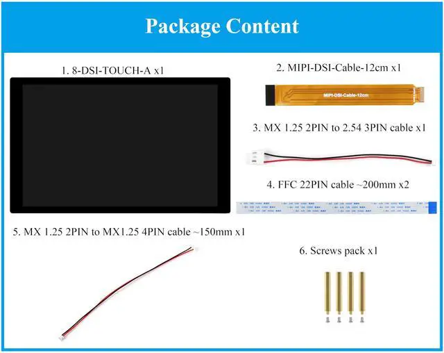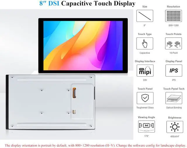8inch DSI touch screen, 10-Point Capacitive Touch control. 800x1280 resolution. Note: The display orientation is portrait by default, with 800×1280 resolution (H×V). Change the software config for landscape display.