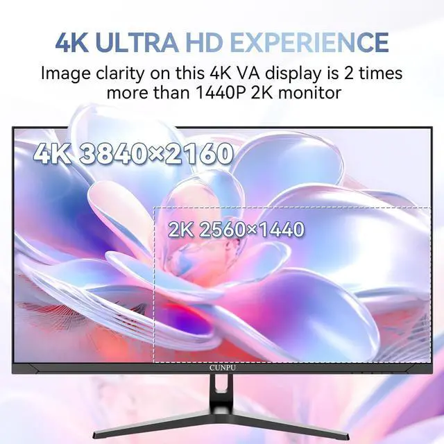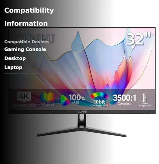 CUNPU 32 inch 4K UHD (3840x2160) Computer Monitor, VA Panel, sRGB 100%, 1.07B Color, 3500:1 Contrast Ratio, VESA 75x75mm, PIP/PBP, HDMI, Display Port, Eye Care, Tilt Adjustable for Game and Work