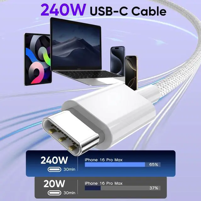 This 240W PD USB C cable can quickly charge phones, tablets, and laptops, also provide you greater charging stability and higher efficiency, protect against overheating, overcharging, short circuiting.