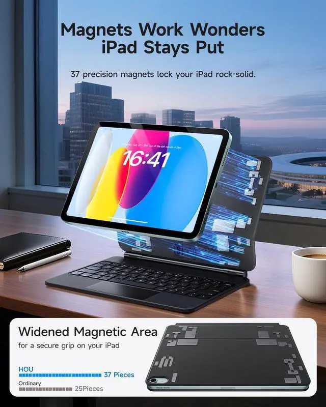 Strong Magnetic Stand with 135° Adjustability: Equipped with 37 powerful magnets for a secure hold. Smoothly adjust your viewing angle up to 135° for typing, watching, or browsing with ease.