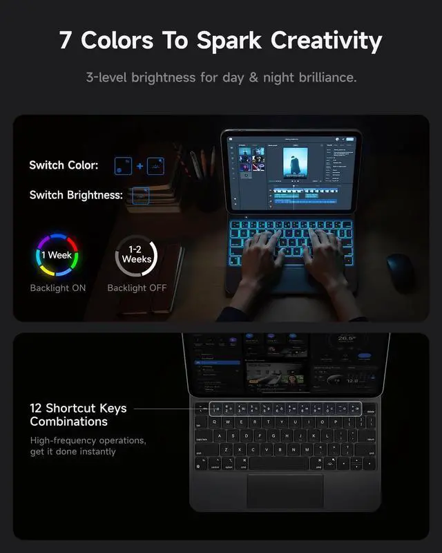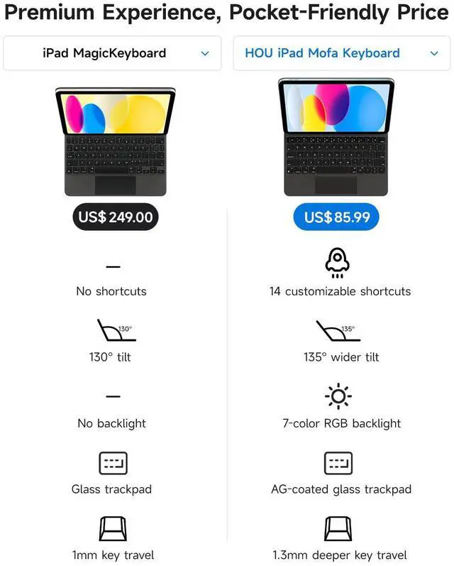 HOU Magnetic Keyboard Case for iPad 11 (A16) /10, 135° Wider Adjustable Tilt, Smooth AG-Glass Touchpad, 12 Shortcut Key Combinations, 7-Color Backlight, Deeper 1.3 mm Key Travel, Bluetooth, Black