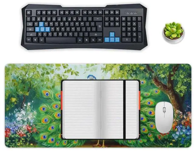 PailailaiNest Desk Pad Mat Large Mousepad Peacock Animal Bird Elegant Green Nature Flower Painting Large Mouse Pad for Desk Pad Mat for Keyboard and Mouse Pad Office Supplies for Desk 40x90cm
