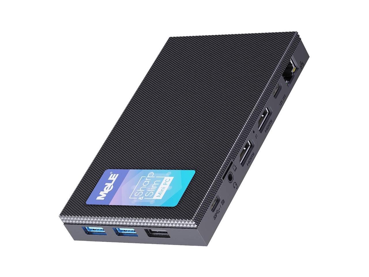 - Fanless Design & Ultra Small Size MeLE mini pc wiondows 11 pro adopted fanless design of 0dB noise offers a silent and comfortable experience. Quieter4C small computer in size only 5.2x3.2x0.7inch and 0.44Lb. This quiet pc can be easily carry out for a business trip. Space saving design comes with a VESA bracket, it can be mounted on the back of a TV/monitor. To improve the tidiness of office desk space. Good choice for light Office work, conference, web browsing, online education etc.