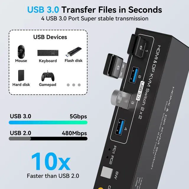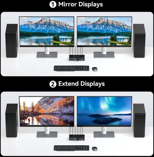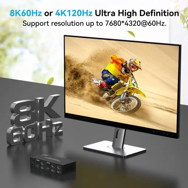 • Support Ultra HD 4K@120hz VisualsThe hdmi dp kvm switch 2 monitors support resolution up to 4K120hz/8K60Hz and is backward compatible with 4K@60Hz,and 1080P@60Hz, Immerse yourself in the world of crystal-clear images,Brings you realistic visual enjoyment . Note: If you need to output 4K@120Hz/8K 60Hz resolution, please make sure your HDMI cable, computer and monitor support 4K120Hz/8K60Hz