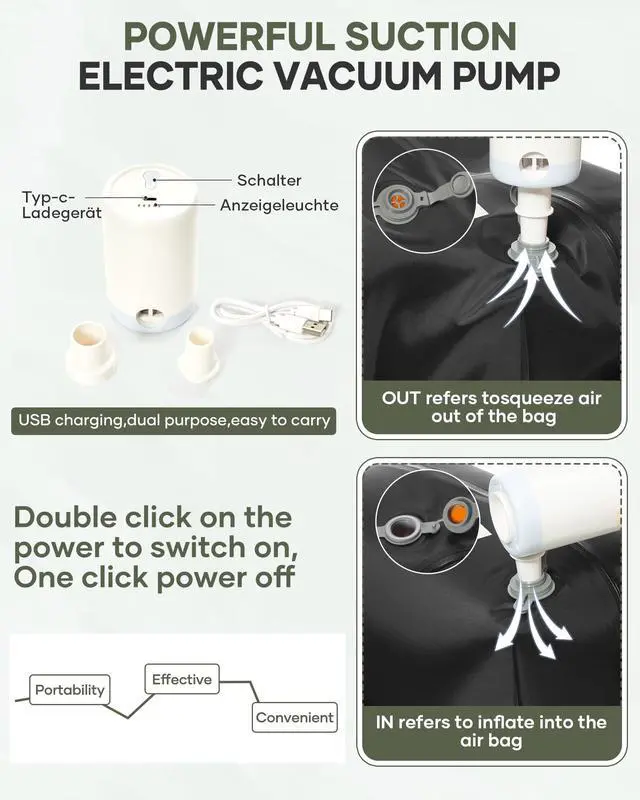 Vacuum system: We're including an electric vacuum pump with every purchase. (Charge cable included) .Press the switch on the electric pump twice, and it will spring into action immediately, rapidly removing air from the bag. Its powerful suction ensures a tight vacuum seal is achieved in no time which drastically reduces the volume of your stored items.Once you're finished, a single press of the switch turns the electric pump off.