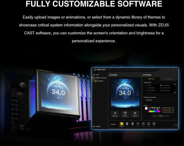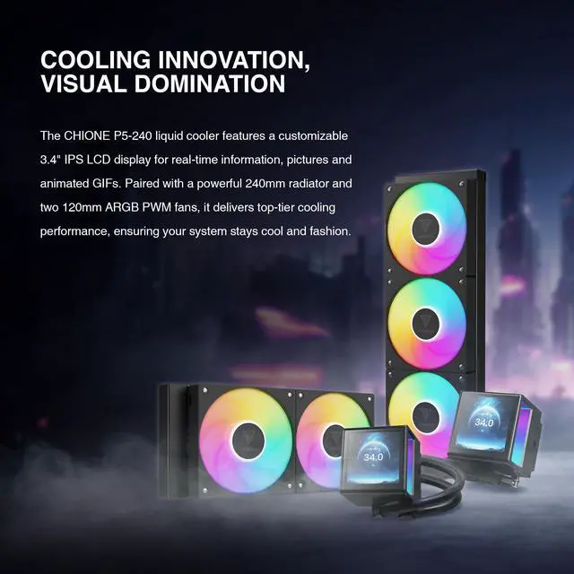 Personalized 3.4" LCD Display w/ Software: CHIONE P5 Series features a vivid 3.4" IPS LCD display that tracks CPU, GPU, and fan stats in real time. Users can customize the screen with personal images or animated GIFs as backgrounds for live data via ZEUS CAST.