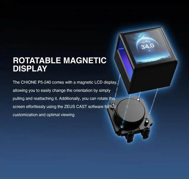 Magnetic, Rotatable and Performance Pump: CHIONE P5 Series includes a detachable magnetic LCD that rotates with ease. Its refined fluid routing system plus a 12-slot 10-pole motor maintain pump speeds up to 2700 RPM, ensuring efficient, quiet cooling.