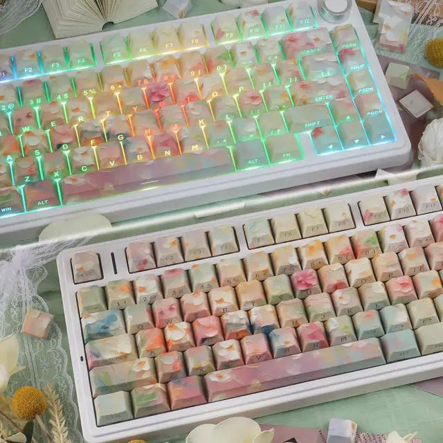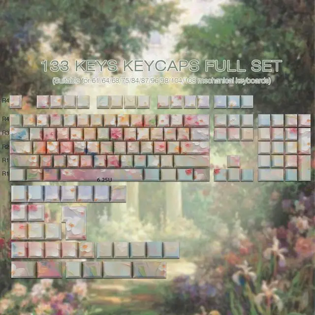 Elevate Your Workspace with a Blossoming Garden Under Your Fingertips Tired of the same old, boring keyboard? Immerse yourself in the tranquil beauty of a classic oil painting every time you type. Our Garden Oil Painting PBT Keycap Set is meticulously designed for mechanical keyboard enthusiasts who seek a perfect blend of high-end art, superior functionality, and unmatched durability. A Canvas on Every Key Weve captured the delicate brushstrokes and rich, blended colors of a traditional garden oil painting onto each keycap. From blooming roses to lush green leaves, the intricate artwork creates a cohesive and breathtaking scene across your entire keyboard, making it a true centerpiece for your desk.