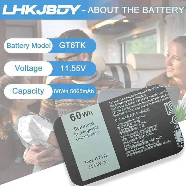 Specifications: Type: GT6TK; Voltage: 11.55V; Capacity: 5065mAh/60Wh; Color: Black. Battery type: Lithium-Ion; The Packages includes: 1pcs GT6TK Laptop Battery Replacement, 4pcs Screwdrivers, 1 pcs Instruction for GT6TK Battery. The batteries are certified by UL and CE, ensuring safety and high performance