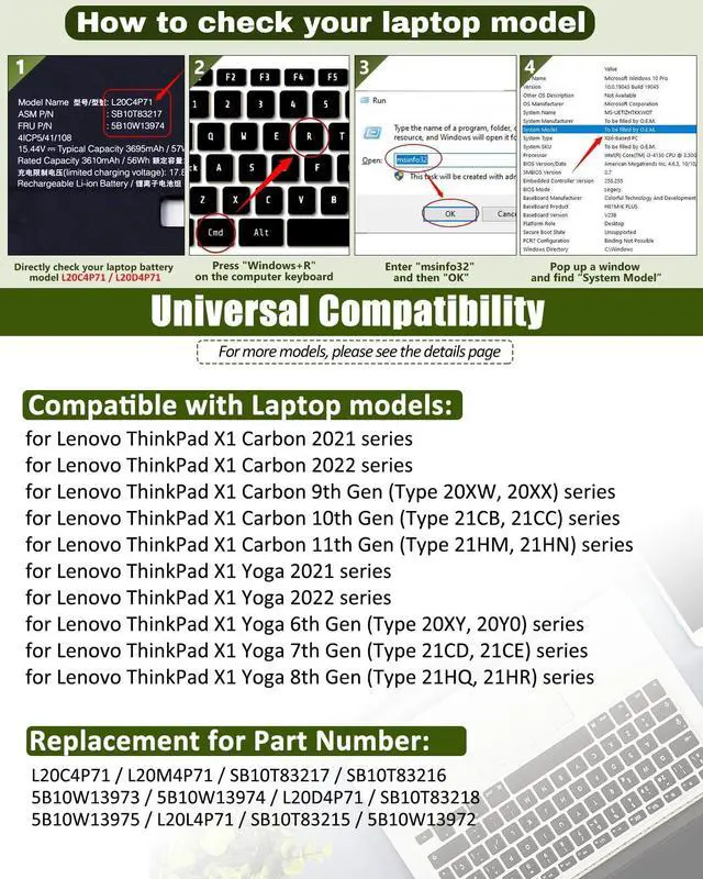 Compatible Models Replacement For Lenovo ThinkPad X1 Carbon 9th Gen (X1 Carbon 2021) Series For Lenovo ThinkPad X1 Carbon 10th Gen (X1 Carbon 2022) Series For Lenovo ThinkPad X1 Yoga 6th Gen (X1 Yoga 2021) Series For Lenovo ThinkPad X1 Yoga 7th Gen (X1 Yoga 2022) Series