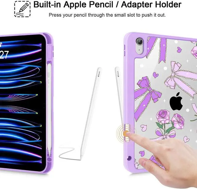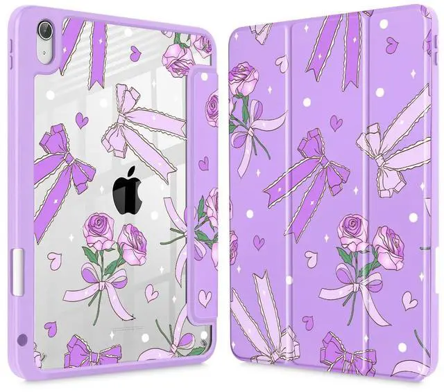 Tuiklol Case for iPad 11 inch (A16 Chip) 2025 Gen 11th / iPad 10.9 inch 2022 10th Gen, Buit in Pencil Holder with Shockproof Cover Clear Transparent Back Shell Auto Wake/Sleep,Bow & Rose Purple