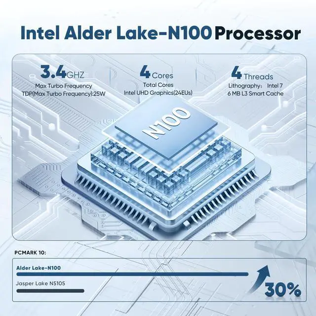 -Alder Lake N100, 4 cores, 4 threads, up to 3.40 GHz, 6M L3 Cache, TDP 6W.