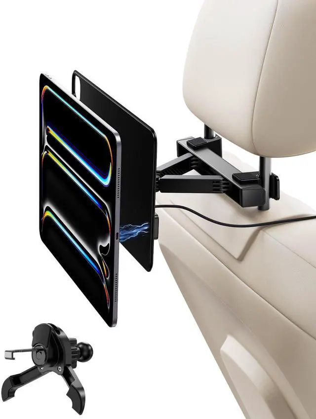 KU XIU Magnetic Wireless Charging Car Holder for iPad: The mount adds Pin Smart Connectors and a USB-C port to the magnetic panel for seamless charging. Simply place your iPad on the charging panel, and connect USB-C charging cable to the holder, then you can instantly activate up to 18W ultra-fast wireless charging mode. While driving, whether for long-distance navigation or in-car movies, you can quickly charge your tablet, saying goodbye to battery anxiety and enjoying a fun journey