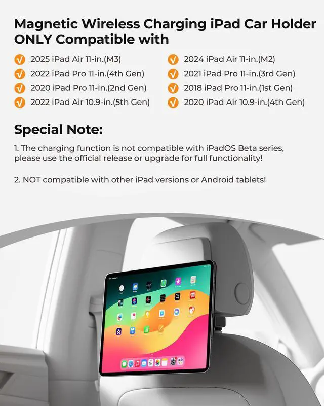 Compatible with iPad Pro 11 & iPad Air 11 M2/M3 ONLY: This magnetic wireless charging car tablet mount is only suitable for iPad Air 11" M3 (2025), iPad Air 11" M2 (2024), iPad Pro 11" (1st/2nd/3rd/4th Gen), and iPad Air 10.9" (4th/5th Gen). Note: KU XIU magnetic car holder is not suitable for other iPad models, Android tablets or other devices. It is recommended to carefully check the compatible models when purchasing to avoid affecting the usage experience
