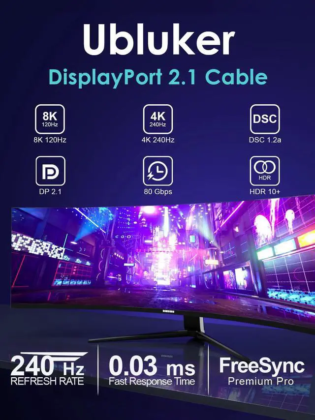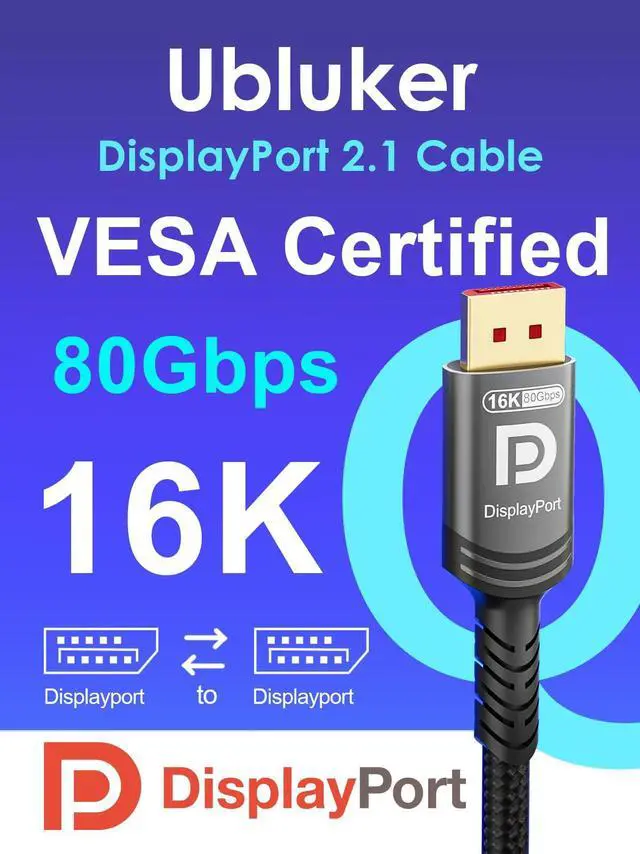 Ubluker 80Gbps DisplayPort 2.1 Cable 10 FT, Certified DP to DP Cord 4K 540Hz 360Hz 240Hz 165Hz 120Hz 16K 8K 240Hz Ultra High Bit Rate UHBR20 DSC1.2a Ryzen 7900X GeForce RTX5090 Laptop PC Monitor