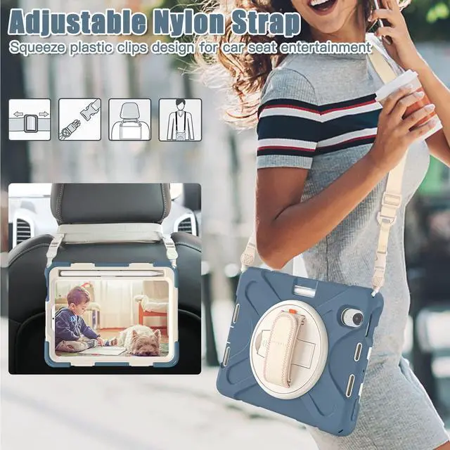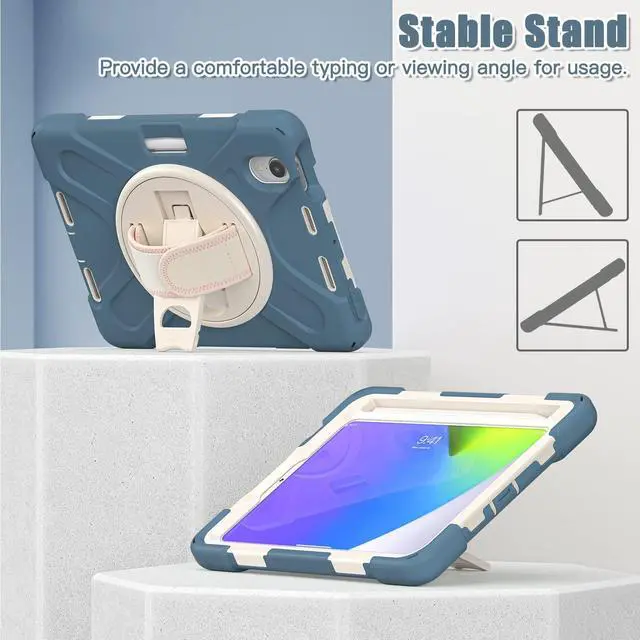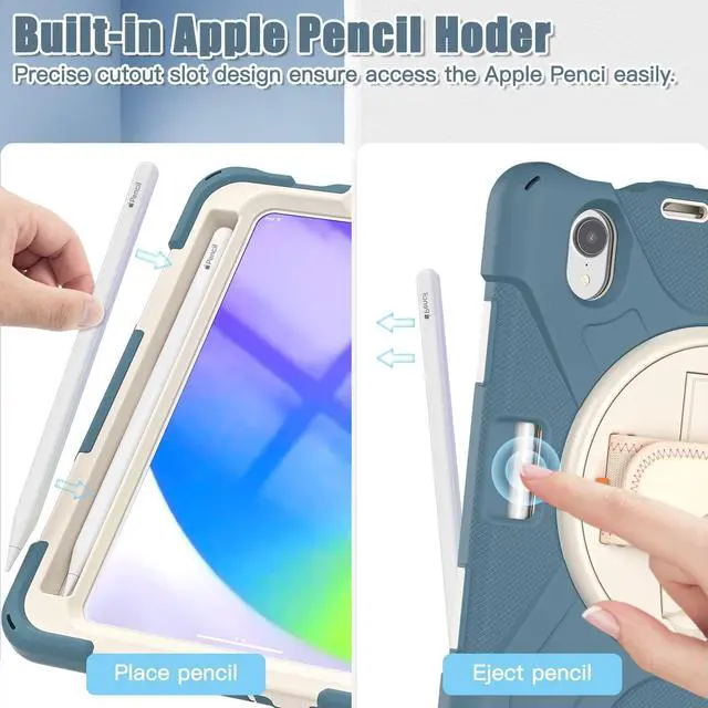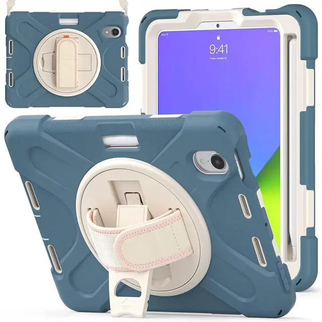 FEATURES: Built-in rotating Kickstand can adjust iPad mini 7 case to whatever angle you want Built-in elastic Pencil Holder makes it easy to pull out and store your Apple pencil Adjustable velcor hand strap allows big hand and small hand, perfect for kids and adults Adjustable and detachable Shoulder belt allows carrying tablet wherever you want