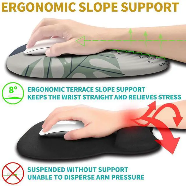 Ergonomic Stepped-wedge SlopeThe innovative ergonomic slope combines perfectly with the stepped wedge design. Effectively supporting the wrist and palm to alleviate pain and fatigue, improve carpal tunnel syndrome (CTS), strengthen air circulation between the wrist and mouse pad, prevent sweating, and keep the wrist in the most comfortable state.