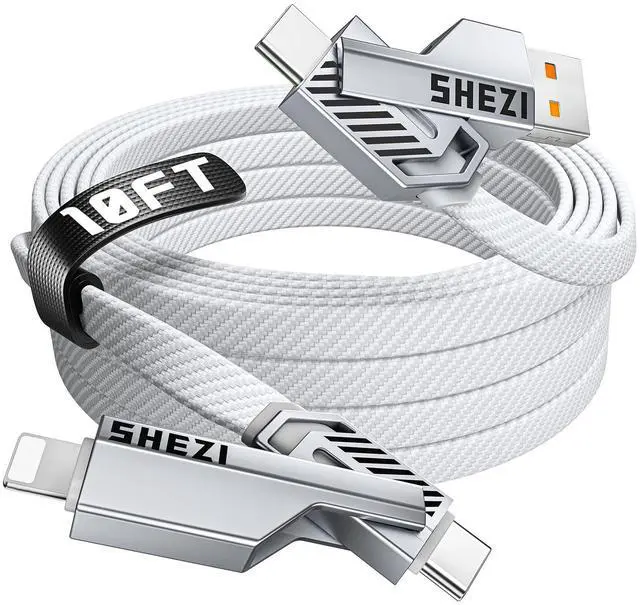 SHEZI [Upgraded 2.0 ] 4-in-1 USB C Cable 60W 10FT Fast Charging [480Mbps Data Sync] Flat Nylon Braided Charger Cord Combo, USB A/C to C/L Multi Charge Cable for iPhone/iPad & Most Devices, Silver