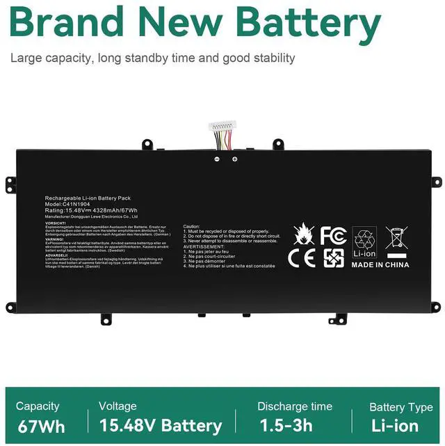 Specifications:Model:C41N1904; Voltage:15.48V;Capacity:67Wh;100% brand new from manufacture. Grade A product ensure fast charges and low power consumption.