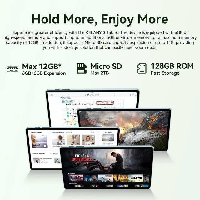 12GB (6GB + 6GB Extended) RAM & 128GB Storage: KELANYIS Tablet offers 12GB RAM(6GB RAM + 6GB RAM expansion) and 128GB Rom. The 12GB of memory, you can quickly launch applications, and with 128GB of storage space, you can enjoy millions of movies and TV shows, bringing you a more convenient and smooth user experience and making application running and data storage smoother