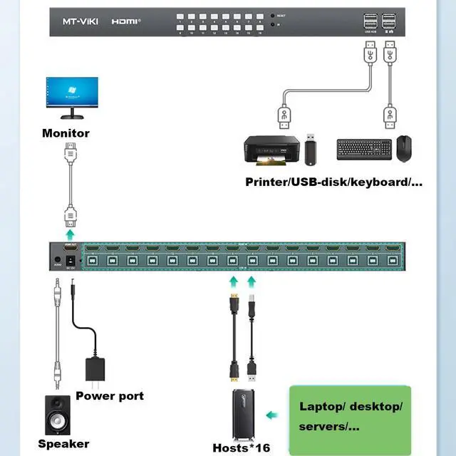 Great CompatibilityJust plug and play, KVM switch HDMI 16 port driver-free for Windows, Mac OS, Linux and Chrome OS.USB HDMI KVM is also compatible with most HDMI source devices, such as PS5, PS4,TV Box, PC, Laptop. It is widely applied for home, office, teaching, meeting room, server room, etc. Supports USB-C/Displayport/VGA to HDMI converter or cable.