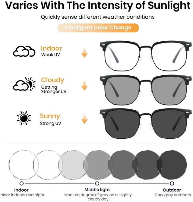 Experience the ultimate in eye care and style with our Photochromic Blue Light Blocking Glasses. Featuring a sleek browline frame and photochromic lenses, these glasses adapt to light conditions, blocking harmful blue light and providing 100% UV protection indoors and outdoors. Designed for both men and women, they reduce eye strain from screens while adding a modern, versatile touch to any outfit. Lightweight and stable, these glasses are perfect for work, gaming, or daily wear a must-have for anyone who values fashion and functionality!