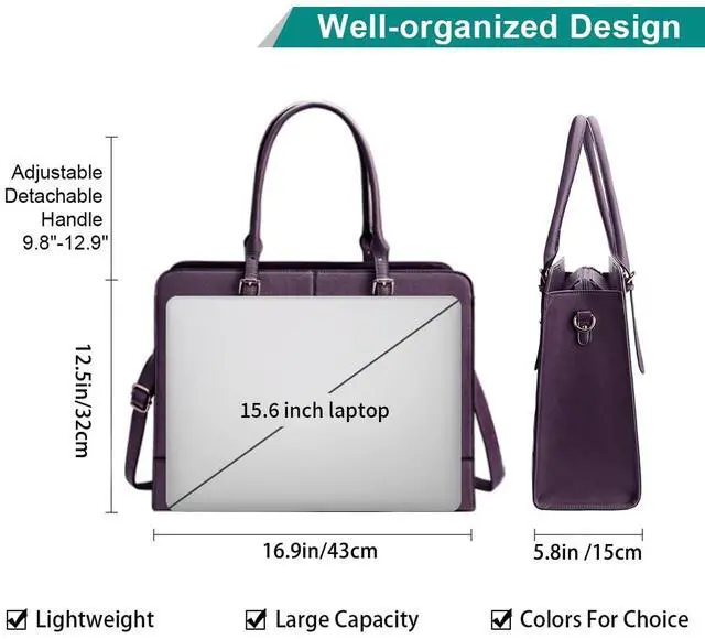 Ideal Organizer Womens Briefcase:Three layers are designed for different use: one laptop compartment to hold a 15.6" laptop and tablet with room to spare; one zip compartment to secure files and two open sections with room for cosmetic, wallet, A4 folder; Multiple pockets for small essentials, bottles; Exactly keep your daily business essentials well organized.