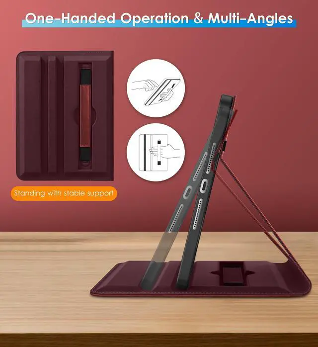Internal embedded 360-degree rotating design, flexible rotation to any angle for comfortable watching movies or typing. Built-in leather hand strap (one-handed operation)