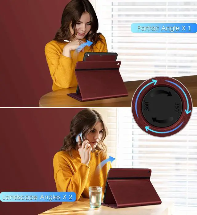 DTTO Rotating Case for iPad 9th/8th/7th Generation 10.2 Inch 2021/2020/2019, 360 Degree Swiveling Premium Leather Folio Stand Cover with Pencil Holder - Auto Wake/Sleep and Hand Strap, Burgundy Red