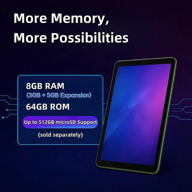 8GB RAM and 64GB storage (expandable up to 512GB) give you ample space for everything that matters. This android 15 tablet supports dual-band WiFi (5G/ 2.4G ), Bluetooth 5.0, GPS, dual cameras, and a 3.5 mm headphone jackmaking it a full-featured tablet for adults thats perfect for home, work, or travel.